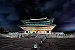 Gyeongbokgung Palace, located in north of Gwanghwamun Square, was built three years after the Joseon dynasty was founded and it served as its main palace.[5] With the mountain Bugaksan behind it and the Street of Six Ministries (today's Sejongno) outside Gwanghwamun Gate, the main entrance to the palace, Gyeongbokgung was situated in the heart of the Korean capital city. It was steadily expanded before being reduced to ashes during the Japanese invasion of 1592.