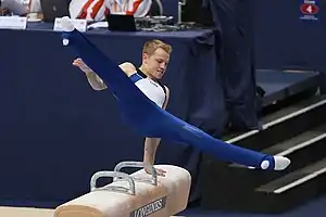 A typical pommel horse exercise involves both single leg and double leg work. Single leg skills are generally found in the form of scissors, an element often done on the pommels. Double leg work, however, is the main staple of this event. The gymnast swings both legs in a circular motion (clockwise or counterclockwise depending on preference) and performs such skills on all parts of the apparatus. To make the exercise more challenging, gymnasts will often include variations on a typical circling skill by turning (moores and spindles) or by straddling their legs (Flares). Routines end when the gymnast performs a dismount, either by swinging his body over the horse or landing after a handstand variation.