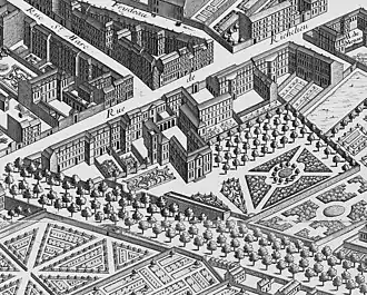 The gallery on the west side of the main floor of the corps de logis had mirrors reflecting the garden like the Galerie des Glaces at Versailles.[6] A fruit garden ran along the boulevard at the north, and there was a kitchen garden (jardin potager) on the other side of the boulevard, which Crozat at great expense had connected to the formal garden with a subterranean passage.[6]