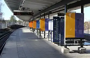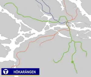 Hökarängen metro station is on the green line of Sweden's Stockholm metro, located in Hökarängen, Söderort. The station was inaugurated on 1 October 1950 as part of the inaugural stretch of Stockholm metro between Slussen and Hökarängen. On 18 November 1958 the line was extended south to Farsta.[2] The distance to Slussen is 7.7 km (4.8 mi).