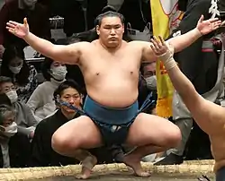 Upon graduation from middle school, he was scouted from Mongolia by the coach of Japan's NSSU Kashiwa High School sumo club, who visited the country to scout for international sports students.[4] There, he was recognized because his coach saw his look, similar to his famous uncle's "who always seemed to be fighting something".[4] Although he did not feel like wrestling yet, he decided to give in to temptation and took a trip to Japan. He was finally recruited and attended Kashiwa High School in Chiba Prefecture, along future professional sumo wrestlers Ōshōma and Asahakuryū.[5] There, he first joined the wrestling club, saying he was afraid of sumo,[3] but in his first year he took part in a school trip and visited the Ryōgoku Kokugikan in Tokyo and became interested in the sport. After consulting with his uncle he committed to trying sumo at the high school level. Though he had no previous experience, he quickly started getting good results in amateur sumo tournaments and was seen as having great potential. In his third year, he was defeated by Tottori Jōhoku High School's wrestler Amartuvshin Amarsanaa at the Inter-High School Championships, allowing Amartuvshin to become the first foreign-born high school-yokozuna in history.[6]