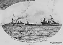 Australia and Sydney reached Jervis Bay on 2 October, where they rendezvoused with the rest of the RAN fleet (the cruisers Encounter and Melbourne, and the destroyers Parramatta, Warrego, and Yarra).[38] The seven warships prepared for a formal fleet entry into Sydney Harbour.[38] On 4 October, Australia led the fleet into Sydney Harbour, where responsibility for Australian naval defence was passed from the Royal Navy's Australia Squadron, commanded by King-Hall aboard HMS Cambrian, to the RAN, commanded by Patey aboard Australia.[40]