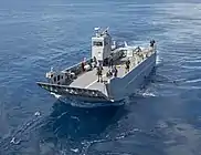 The LCMs can be loaded from either of Canterbury's two 60 tonne cranes or via the stern ramp. To aid stern ramp loading, the MRV is fitted with Flippers to ensure that the LCM are aligned with the MRV. A ballasting system is fitted to allow for safe operations during loading. Once loaded, the LCM can conduct over-the-beach landings, with the boats mainly intended to be able to access beaches in the Pacific where no port facilities are available, for example during humanitarian missions.[18]