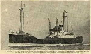 HMNZS Puriri (T02) was a coastal cargo boat which was requisitioned by the Royal New Zealand Navy (RNZN) and converted into a minesweeper. She was sunk by a German mine 25 days after she was commissioned.