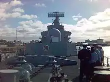 Bristol was refitted at A&P Tyne, Hebburn. The effects of the refit were said to "... extend the service life of HMS Bristol for 10 years". Work was intended to bring facilities on Bristol in line with health and safety standards.[7] The redundant masts containing the ship's Type 1022 and Type 992Q search radars were removed.[8] She departed from Portsmouth on 20 October 2010,[9] and arrived at Hebburn under tow on the morning of 3 November 2010. HMS Bristol left Hebburn in April 2011[10] to return to Portsmouth.