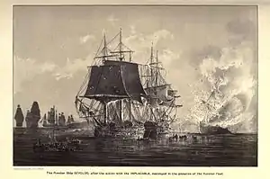 However, just outside the port, Centaur was able to collide with Vsevolod. A party of seamen from Centaur then lashed her mizzen to the Russian bowsprit before Centaur opened fire. Vsevolod dropped her anchor and with both ships stuck in place, both sides attempted to board the other vessel. In the meantime, Implacable had come up and added her fire to the melee. After a battle of about half an hour, the Russian vessel struck again.[7]