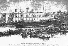 The last of six 8-gun Mariner-class gunvessels designed by Nathaniel Barnaby,[1] the Royal Navy Director of Naval Construction, her hull was of composite construction; that is, iron keel, frames, stem and stern posts with wooden planking. She was fitted with a 2-cylinder horizontal compound expansion steam engine driving a single screw, which was also built in the Malta Dockyard.[1] She was rigged with three masts, with square rig on the fore- and main-masts, making her a barque-rigged vessel. Her keel was laid at a special slipway built for her on the Senglea side of French Creek, which was still known as the "Melita Slip" into modern times.[2] Although laid down on 18 July 1883,[1] work progressed slowly; the entire enterprise had been designed to employ the local workforce when the Mediterranean Fleet was absent, and the fleet's frequent presence caused work on the new vessel to be halted all too often.[2] She was launched as Melita, the Latin name for the Malta, on 20 March 1888 by Princess Victoria Melita, the twelve-year-old daughter of the Duke of Edinburgh who was Commander-in-Chief of the British Mediterranean Fleet.[2] The Army and Navy Gazette reported that