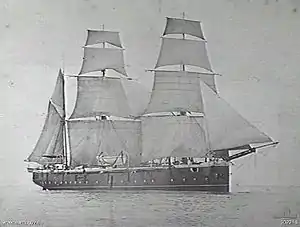 All the ships of the class were provided with a barque rig,[1] that is, square-rigged foremast and mainmast, and fore-and-aft sails only on the mizzen mast.
