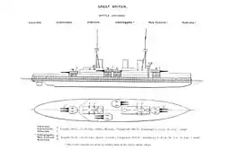 The ship carried eight BL 12-inch Mk X guns in four twin gun turrets. Two turrets were mounted fore and aft on the centreline, identified as 'A' and 'X' respectively. The other two were wing turrets mounted amidships and staggered diagonally: 'P' was forward and to port of the centre funnel, while 'Q' was situated starboard and aft. Each wing turret had a limited ability to fire to the opposite side, but if the ship was full broadside to her target she could bring all eight main guns to bear. Her secondary armament consisted of sixteen 4-inch BL Mk VII guns positioned in the superstructure.[7] She mounted two 18-inch submerged torpedo tubes, one on each side aft of 'X' barbette, and twelve torpedoes were carried.[8]