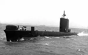 As designed for British service, the Oberon-class submarines were 241 feet (73 m) in length between perpendiculars and 295.2 feet (90.0 m) in length overall, with a beam of 26.5 feet (8.1 m), and a draught of 18 feet (5.5 m).[2] Displacement was 1,610 tons standard, 2,030 tons full load when surfaced, and 2,410 tons full load when submerged.[2] Propulsion machinery consisted of 2 Admiralty Standard Range 16 VMS diesel generators, and two 3,000 shaft horsepower (2,200 kW) electric motors, each driving a 7-foot diameter (2.1 m) 3-bladed propeller at up to 400 rpm.[2] Top speed was 17 knots (31 km/h; 20 mph) when submerged, and 12 knots (22 km/h; 14 mph) on the surface.[2] Eight 21-inch (530 mm) diameter torpedo tubes were fitted (six facing forward, two aft), with a total payload of 24 torpedoes.[2] The boats were fitted with Type 186 and Type 187 sonars, and an I-band surface search radar.[2] The standard complement was 68: 6 officers, 62 sailors.[2]