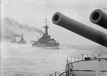 Between 17 and 20 July 1914, Thunderer took part in a test mobilisation and fleet review as part of the British response to the July Crisis. Arriving in Portland on 25 July, she was ordered to proceed with the rest of the Home Fleet to Scapa Flow four days later[12] to safeguard the fleet from a possible surprise attack by the Imperial German Navy.[14] In August 1914, following the outbreak of World War I, the Home Fleet was reorganised as the Grand Fleet, and placed under the command of Admiral Jellicoe.[15] Repeated reports of submarines in Scapa Flow led Jellicoe to conclude that the defences there were inadequate and he ordered that the Grand Fleet be dispersed to other bases until the defences be reinforced. On 16 October the 2nd BS was sent to Loch na Keal on the western coast of Scotland. The squadron departed for gunnery practice off the northern coast of Ireland on the morning of 27 October and the dreadnought Audacious struck a mine, laid a few days earlier by the German armed merchant cruiser SS Berlin. Thinking that the ship had been torpedoed by a submarine, the other dreadnoughts were ordered away from the area, while smaller ships rendered assistance. On the evening of 22 November 1914, the Grand Fleet conducted a fruitless sweep in the southern half of the North Sea; Thunderer stood with the main body in support of Vice-Admiral David Beatty's 1st Battlecruiser Squadron. The fleet was back in port in Scapa Flow by 27 November.[16] On 8 December, she sailed to Devonport for a brief refit to fix problems with her condensers.[12]