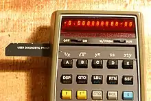A program could be saved to mylar-based magnetically coated cards measuring 71 mm × 9.5 mm (2.8 in × 0.4 in), which were fed through the reader by a small electric motor through a worm gear and rubber roller at a speed of 6 cm/s (2.4 in/s).[3] The recording area used only half of the width of the card. While reversing the card to store a second program was possible, it was officially discouraged (unlike in later models such as the HP-67) because the other half of the card was touched by the rubber wheel during transport, causing extra abrasion. When inserted into an extra slot between the display and the keyboard, the printing on top of the card would correspond to the top row of keys (A - E), which served as shortcuts to the corresponding program entry points.