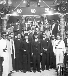 In the beginning of the 1930s, Habib Bourguiba, feeling the effects of colonial inequalities, decided to join the main political party of the Tunisian national movement, the Destour, alongside his brother M'hamed and his mates Bahri Guiga, Tahar Sfar and Mahmoud El Materi.[29] Revolted by the festivities of the 30th eucharistic congress, held from 7 to 11 May 1930 in Carthage, and which he considered as a "violation of islamic lands", the young nationalists found it necessary to get involved. With the upcoming preparations for the 50th anniversary celebration of the protectorate and the scheduled visit of French president Paul Doumer, the young nationalists decided to act. Bourguiba denounced the rejoicing, in the newspaper Le Croissant, ran by his cousin Abdelaziz El Aroui, as a "humiliating affront to the dignity of the Tunisian people to whom he recalls the loss of freedom and independence". Therefore, the leaders of the Destour party gathered in emergency at Orient Hotel, in February 1931, where it was decided to found an endorsing committee to the newspaper of Chedly Khairallah, La Voix du Tunisien, which switched from weekly to daily and has among its editors the young nationalist team.[30]