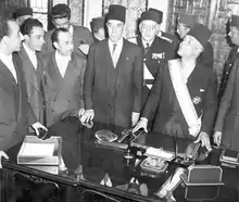 The speeches and determination to act of this new generation of nationalist was greatly welcomed by the Tunisian population which did not hesitate to criticize the "neglect of the Destour leadership to defend their interests".[50] Upon the refusal of the executive committee to organize a special congress aiming to change their political orientations and thanks to the support of the population and notables, the "secessionists" decided to hold their own congress in Ksar Hellal on 2 March 1934.[51] During the event, Bourguiba called the representatives to "choose the men who shall defend in their name the liberation of the country". The congress ended with the founding of a new political party, the Neo-Destour, presided by El Materi, and Bourguiba was designated chairman.[52]