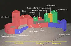 Today the "large" and "small" towers of the original castle are preserved, attached to a residential building of the 13th century, while large parts of the complex lie in ruins. The extent of its eastern part is recognizable only by foundation walls. The palatial residence hosts a restaurant and a small exhibition.[3]