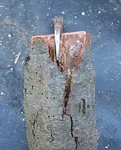 The side knife may be used as a light froe, for splitting small billets of wood.[1] It is driven through the billet using a hammer. Unlike a froe's extended handle, the side knife does not permit twisting to lever the split open and so it must be driven through all the way.
