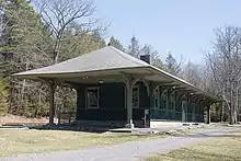 Haines Falls is a hamlet (and census-designated place)[1] located east of Tannersville in the Town of Hunter, in Greene County, New York, United States.[2][3] Haines Falls is located at 42°11′45″N 74°5′49″W.[4] The hamlet of Haines Falls was always a mountain resort town, unlike Hunter and Palenville which had tanneries. Haines Falls is at the head of Kaaterskill Clove and is the former site of the Catskill Mountain House, Kaaterskill Hotel, and Laurel House which sat atop the famous Kaaterskill Falls. In 1825, Thomas Cole, founder of the Hudson River School of landscape painters, did his first Catskill mountain paintings in Haines Falls: Lake with Dead Trees at South Lake and the Kaaterskill Falls.