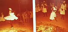 Vodou's nocturnal gatherings are often referred to as the dans ("dance"), reflecting the prominent role that dancing has in such ceremonies.[243] Their purpose is to invite a lwa to enter the ritual space and possess one of the worshippers, through whom they can communicate with the congregation.[318] The success of this procedure is predicated on mastering the different ritual actions and on getting the aesthetic right to please the lwa.[318] The proceedings can last for the entirety of the night.[243]