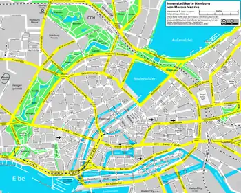 Geographically, the Wallring starts at Stintfang on the Elbe shore.[2] Traffic-wise, the Wallring starts at Millerntordamm, off Millerntorplatz.