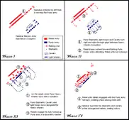The rebels held the hills to the west of Carthage and the only bridge across the Bagradas river leading to Utica.[56] Hamilcar observed that wind blowing from a certain direction uncovered a sandbar at the river mouth that was fordable and, under cover of night, the Punic army left Carthage and crossed the river. Hamilcar aimed to attack the small rebel band holding the bridge, but Spendius led the rebel force besieging Utica to confront Hamilcar. The Carthaginian army was caught in a pincer movement; Hamilcar pretended to retreat, and Spendius likely attempted to trap the outnumbered Carthaginians against the river with his two forces, pinning them with one and out-flanking them with the other. When his troops rushed towards the retreating Carthaginians, Spendius was either unable to control them or believed that the Carthaginians were fleeing and encouraged his forces' pursuit.[57] Hamilcar had managed to train his new recruits in some drill and basic battlefield maneuvers before they left Carthage.[58] As the two rebel forces came into clear sight the Carthaginians wheeled, and marched away. The Carthaginians were marching in good order so they could perform a pre-planned manoeuvre which they had practiced in Carthage, but the rebels, many of whom were inexperienced soldiers, believed that the Carthaginians were running away. Shouting encouragement to each other they broke into a run to pursue.[59] Hamilcar unleashed his trap as the disorderly rebels closed on his formation. As the cavalry and then the elephants came closer to the infantry Hamilcar ordered each in turn to also wheel about to face the rebels.[60] The modern historian Dexter Hoyos stresses that "[s]uch manoeuvres were about the simplest that any army could learn, once it mastered the absolute basics of marching in formation".[60]