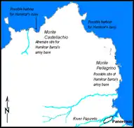 Hamilcar next raided Locri in Bruttium and the area around Brindisi in 247 BC.[25] On his return he seized a strong position on Mount Ercte (Monte Pellegrino, just north of Palermo or Mt. Castellacio, 7 miles north-west of Palermo),[26] and not only maintained himself against all attacks, but carried on with his seaborne raids ranging from Catana[27] in Sicily to as far as Cumae in central Italy.[28][29] He also set about improving the spirit of the army, and succeeded in creating a highly disciplined and versatile force. While Hamilcar won no large-scale battle or recaptured any cities lost to the Romans, he waged a relentless campaign against the enemy, and caused a constant drain on Roman resources. However, if Hamilcar had hoped to recapture Panormus, he failed in his strategy. Roman forces led by the consuls Manius Otacilius Crassus and Marcus Fabius Licinus achieved little against Hamilcar in 246 BC, and the consuls of 245 BC, Marcus Fabius Bueto and Atilius Bulbus, fared no better.