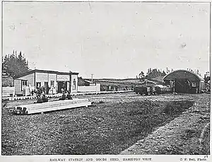 On 1 October 1884 the station reopened as Hamilton West,[13] when the Morrinsville line opened.[14] By 1884 it had a 4th class station building, platform, cart approach, 60 ft (18 m) by 30 ft (9.1 m) goods shed and loading bank. In 1896 there was also a stationmaster's house, urinals and a passing loop for 38 wagons.[7] In 1892 the station got improved and increased accommodation, with further improvements in 1897, 1899 and 1900, when a verandah was added.[7]