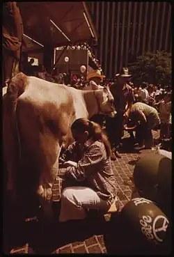 ![]() A celebrity cow milking contest on Fountain Square advertises the 1973 Carthage Fair. | |