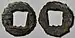 The Warlord Dong Zhuo moved the capital city from Luoyang to Chang'an in the year 190 and proceeded to melt down large bronze statues dating to the beginning of the Qin dynasty, the Twelve Metal Colossi, in order to manufacture small cash coins.[15] Many of these cash coins produced by the warlord Dong Zhuo were so small that the Chinese would popularly refer to them as either "goose eye cash coins" (traditional Chinese: 鵝眼錢; simplified Chinese: 鹅眼钱; pinyin: É yǎn qián) or "chicken eye cash coins" (traditional Chinese: 雞目錢; simplified Chinese: 鸡目钱; pinyin: Jī mù qián).[15] Despite their rather crude appearances, the Chinese characters present on these smaller coins are actually very well cast in high relief.[15] A number of these diminutive cash coins bore the Wu Zhu inscription, but because of their small sized only the left half of the Chinese character "Wu" (五) and the right half of the "Zhu" (銖) character would actually fit on the coin.[15] The "Zhu" character present to the left side of the square central hole is notably distinctive in the fact that the character extends from the top of the outer rim to its bottom.[15] Note that this type of Wu Zhu cash coin is different from what Chinese people typically refer to as "chiselled rim cash coins" (traditional Chinese: 鑿邊錢; simplified Chinese: 凿边钱; pinyin: Záo biān qián), where a normal size Wu Zhu cash coin would have had its inside cut out in order to turn a single cash coin into two cash coins.[15]