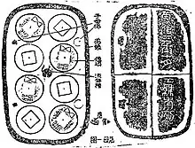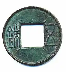 During the reign of Emperor Ling, a type of Wu Zhu cash coin known as "corner coins" (角錢) are believed to have been produced in the year 186 AD.[30] Cities in ancient China had city walls built surrounding them as a means of fortification and protection.[30] It is said that the square central hole of these "corner coins" represented the city and that the 4 lines going out of the coin symbolised wealth flowing out, portending the fall of the Eastern Han dynasty in the year 220 AD.[30]