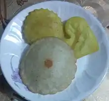 Handesh also known as Guror Handesh in Bangladesh is a sweet and puffy deep-fried Pitha which also be eaten as a snack.[1] It is a deep-fried molasses and rice flour cake. It is very popular at the time of the Eid.[2] In the earlier days, like other Pithas, this delicacy used to be made from rice threshed by the unmotorized Dheki.[3] It can be eaten with tea as a snack.[4] It is also famous on special occasions such as naming ceremonies and wedding festivities.[5] In Assam, India Its called Tel Pitha.