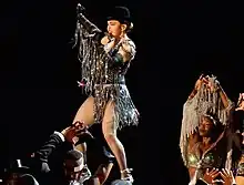"Hanky Panky" was first performed on Madonna's third concert tour, the Blond Ambition World Tour of 1990. She performed the song dressed in a green and white striped vaudeville-style corset, playing the part of a nightclub singer, standing in front of a microphone. Near the end of the performance, Madonna joked: "You all know the pleasures of a good spanking, don't you? [...] When I hurt people, I feel better, you know what I mean?".[53][54] Regarding the "shameless promotion" of Dick Tracy in this segment, author Lucy O'Brien said that "along with her yen for artistic expression, Madonna has always had an eye on the bottom dollar... [But] the Dick Tracy section is the least dynamic part of the show".[55] Two different performances were released on video, the first was included in Blond Ambition Japan Tour 90, taped from the performance at Yokohama Stadium in Yokohama, Japan, on April 27, 1990,[56] and the other one included on Blond Ambition World Tour Live, taped at the Stade de l'Ouest in Nice, France, on August 5, 1990.[57]