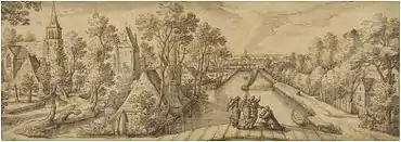 Bol is principally known for his extensive graphic oeuvre of both uncoloured drawings and prints. His earliest known drawing depicting a Landscape with trees and a watermill (signed and dated 1557, Museum Boijmans Van Beuningen) shows the influence of Pieter Bruegel the Elder. In the drawing Bol distanced himself from the Flemish tradition of the world landscape with its imaginary mountain landscapes with jagged rocks in favor of a more realistic approach based on observation of nature. The drawing also points to Bol's possible familiarity with the work of the Master of the Small Landscapes, an unidentified artist from that time whose drawings for two series of prints show innovative, idealized rural scenes from around Antwerp in 1559 and in 1661.[9] The Master of the Small Landscapes depicted real rather than imaginary landscapes, something which would be influential on future Flemish landscape artists, including Bol.[10]