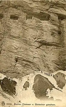 With the completion of the Jungfrau Railway, Kaufmann sometimes began his climbs of the Eiger or Jungfrau not just from the Eiger Gletscher station[51] (finished in 1898) but from the Eismeer stop (1905) and the Jungfraujoch terminus (1912) itself. For example, Kaufmann guided Stuart D. Morris with Edith and Gladys Hunt "up the Jungfrau from Jungfraujoch . . . [starting] at 6:30, [reaching] the summit at 5:50 and getting back to the Jungfrau station at 9:50."[52]