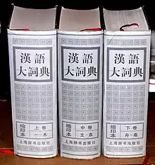 - Compact edition (漢語大詞典 縮印版) (ISBN 7-5326-2408-0/ISBN 978-7-5326-2408-9/H.331): Based on the 12-volume edition. Includes over 370,000 entries, over 23,000 head characters, 347,426 compound words. 3 volumes.