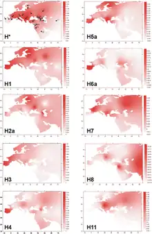 Haplogroup H is a human mitochondrial DNA (mtDNA) haplogroup. The clade is believed to have originated in Southwest Asia, near present day Syria,[1] around 20,000 to 25,000 years ago. Mitochondrial haplogroup H is today predominantly found in Europe, and is believed to have evolved before the Last Glacial Maximum (LGM). It first expanded in the northern Near East and Southern Caucasus soon, and later migrations from Iberia suggest that the clade reached Europe before the Last Glacial Maximum. The haplogroup has also spread to parts of Africa, Siberia and inner Asia. Today, around 40% of all maternal lineages in Europe belong to haplogroup H.