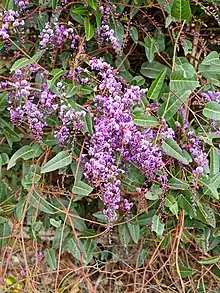 Hardenbergia violacea is a species of flowering plant in the family Fabaceae and is endemic to Australia. It is known in Australia by the common names false sarsaparilla, purple coral pea, and waraburra.[2] Elsewhere it is also called purple twining-pea, vine-lilac, and wild sarsaparilla.[3] It is a prostrate or climbing subshrub with egg-shaped to narrow lance-shaped leaves and racemes of mostly purple flowers.