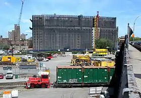 Harlem River Yards was a 96-acre freight rail yard owned by the Penn Central Railroad, which in turn acquired the yard and associated lines in 1969 when it consummated a regulatory-induced, forced merger with the New Haven Railroad.[8] When the Penn Central went into bankruptcy in the 1970s, the State of New York condemned the rail yard and placed it under the stewardship of the state's Department of Transportation.[7] The yards were a key component of New York's Full Freight Access Program, a multi-decade effort to create manufacturing jobs by modernizing rail freight transportation in New York City and Long Island. This project involved raising vertical clearance on the rail lines along the east shore of the Hudson River from the Albany area into New York City and Long Island to accommodate Trailer on Flatcar (TOFC) intermodal freight transport, and the construction of the Oak Point Link.[1][7] However, efforts to develop an intermodal rail facility at Harlem River Yards were frustrated due to multiple factors, including a lack of commercial interest and shifting political priorities.[2][7] The Oak Point Link finally opened in 1998, but connected to a small intermodal facility at Harlem River Yards which used a small 28-acre portion of the site.[1]