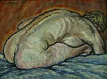 The catalogue Wild Exuberance: Harold Weston’s Adirondack Art describes the paintings: "The nudes deviated from a long tradition of beauty that aspired to perfection. These were no Botticelli or Titian Venuses, but cropped body parts painted as if with earth and flesh, whose primitive honesty complicated beauty with uncomfortably raw emotion and sex. These were not tame, pastoral scenes through which one could take a bourgeois stroll, but the wild. Unlike pretty nudes displayed for the male gaze, these were something more about the woman herself."[5] The series of paintings came to be known as "landscape nudes" after John Marin said, "I feel the woods and the mountains in these nudes."[6] Alfred Stieglitz considered the nudes daring and new, but they were too radical for the Montross Gallery to exhibit.