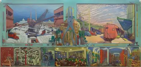 In 1935 Weston competed for a Treasury Relief Art Project mural commission to paint murals depicting the government's efforts to speed the end of the Great Depression. For two-and-a-half years Weston worked 11 hours a day creating 840 square feet of 22 panels on canvas that were hung in the General Services Administration building in Washington, D.C., in 1938. At a time of intensive mural-painting in the country, Phillips said Weston's murals were "magnificent--the best by far of all the government murals."[9]
