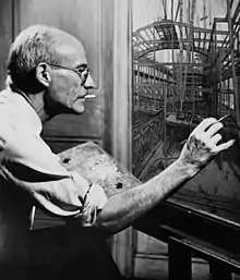 Humanitarian concerns at the advent of World War II compelled Weston to give up painting. "For the first time in my life, something seemed more important to me than painting," wrote Weston.[10] First, in the Adirondacks, he organized a branch and 11 chapters of the Committee to Defend America by Aiding the Allies. Then after Pearl Harbor, with memories of the starvation he had seen during the war in the Middle East, he moved to Washington, D.C., to advocate full-time for humanitarian food relief. He outlined a plan that he called the Reconstruction Service Committee, for which he obtained the support of Eleanor Roosevelt, and which eventually evolved into the United Nations Relief and Rehabilitation Administration. "[Weston] more than anyone else -- as Mrs. Eleanor Roosevelt has written me -- was responsible for the original conception and carrying through of UNRRA," wrote Lewis Mumford.[11] UNRRA saved millions of lives after the war.