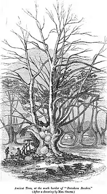 Then for reasons detailed by Harriet Grote in her Account of the Hamlet of East Burnham, they decided to leave the area.[2] According to Francis George Heath, writing on Burnham Beeches in 1879, "no right of estovers has belonged to the commoners of East Burnham, and the lord of the manor ... had alone the sole right of touching the trees."[30] Grote's work deals in part with "commoners' rights and privileges, and ... her efforts to maintain them on behalf of her poor neighbours".[31] In 1885, when the East Burnham Common was bought by the Corporation of London, it was considered that the commoners had rights of pasture and turbary, but not estovers.[32] There is evidence, however, that pollarding of the trees did occur in conjunction with pasturage.[33]