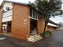 Harristown's new administration block was a result of growth at the school, "where an administrative unit of this pleasing character [had] become necessary".[50] The administration block (the northern section of Block Z in 2016) was added to the west of Block B c. 1957-8.[51] Connected to the northwest corner of the ground floor of Block B by a covered way, it included concrete paved indoor-outdoor areas; a raised concrete dais and a garden plot to the northeast; male and female toilets at the east end of the building; two staff rooms to the west; offices for the Principal and Deputy Principal at the west end of the building; and two brick flower boxes and a raised area of concrete pavers outside the northwest entrance. The building was sheeted with metal, with stone feature walls at the southwest corner and a brick wall at the east end, and had clerestory windows on the south side.[52] The use of stone was a deliberate move to improve the aesthetics of the school. In 1959 it was noted that, as high schools grew, they needed "elements of maturity", the aim being "to develop pride in the school and to supplement academic education with desirable aesthetic experience".[50][1]
