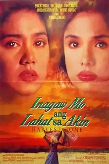 Harvest Home (Filipino: Inagaw Mo Ang Lahat Sa Akin / transl. You Stole Everything from Me) is a 1995 Philippine melodrama film directed by Carlos Siguion-Reyna and produced by Armida Siguion-Reyna. The film stars Maricel Soriano and Snooky Serna as sisters reunited after the death of their father. Based on a story by Oscar Miranda, Bibeth Orteza, and Carlos Siguion-Reyna, it was written for the screen by Orteza.