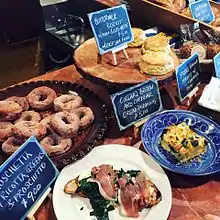Harvest Moon Cafe served dinner and Sunday brunch. The restaurant described its food as New American cuisine, when Zagat has described it as "Cal-Med" (California cuisine-Mediterranean cuisine).[7] Harvest Moon Cafe used primarily locally sourced seasonal ingredients.[4] Each night, the restaurant's menu had six appetizers and five entrees available.[1] The menu included steak from Niman Ranch, polenta with artichokes, potato soup and chicory salad.[4][8] The restaurant also makes their own charcuterie. Desserts may have included pot de creme or cobbler. Harvest Moon had approximately 32 wines by the bottle.[1]