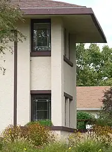 The ornamental glass "light screens" in this house were designed by Wright with the assistance of Oak Park Studio draughtswoman, Isabel Roberts, who would later become an architect in her own right.[24] They were fabricated by the Temple Art Glass Company of Chicago, which was the same firm Wright had just used for his renowned Unity Temple (Oak Park, Illinois, 1905).[25]