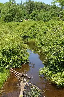 The average annual rate of precipitation in the watershed of Harveys Creek ranges from 35 to 45 inches (89 to 114 cm).[8] The creek's water temperature is typically low, even in the summer.[9] During the 1970s, the water temperature of the creek was as low as 3.0 to 3.5 °C (37.4 to 38.3 °F) in the winter and as high as 15.0 to 26.0 °C (59.0 to 78.8 °F) in the spring and summer.[6]