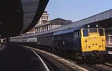 Prior to the station's re-development, and its revised layout, it consisted of two through-platforms serving the then double-track line to Harwich Town. This was supplemented by a bay platform at the eastern end of the main platform (the present-day platform 1) which handled Harwich to Parkeston local services, which in the days of steam generally consisted of a J15 and later N2 or N7 tank engines and up to four carriages.[4] This service was timed to suit shift times both on the quay and in adjoining offices, the majority of workers being railway employees. The bay also had a loop allowing the running round of the locomotive. The main platform was and still is of sufficient length to accommodate a boat train of 10 or 11 coaches. The "up" (westbound) through-platform was shorter but this did not prevent it being used by the North Country boat train in the morning, which consisted of 11 or 12 carriages and would overhang the end of the platform considerably, but in those days there was no level crossing at the eastern end of the station.