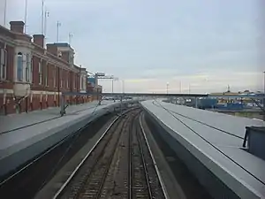 The Manningtree to Harwich local service used the last one-third of the main platform using a third central access line, which joined the platform at that point allowing a ticket barrier to be used for that part of the platform exclusively.[5] This arrangement allowed a five- or six-coach train to sit at the western end of that platform without the need for any shifting, whereas a full boat train would have to move temporarily towards the west to allow the local train access.