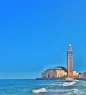 The Hassan II Mosque (Arabic: مسجد الحسن الثاني, French: Grande Mosquée Hassan II) is a mosque in Casablanca, Morocco. It is the largest functioning mosque in Africa and is the 14th largest in the world. Its minaret is the world's second tallest minaret at 210 metres (689 ft).[2][3] Completed in 1993, it was designed by Michel Pinseau under the guidance of King Hassan II and built by Moroccan artisans from all over the kingdom. The minaret is 60 stories high topped by a laser, the light from which is directed towards Mecca.[4] The mosque stands on a promontory looking out to the Atlantic Ocean; worshippers can pray over the sea but there is no glass floor looking into the sea. The walls are of hand-crafted marble and the roof is retractable. A maximum of 105,000 worshippers can gather together for prayer: 25,000 inside the mosque hall and another 80,000 on the mosque's outside ground.[3]