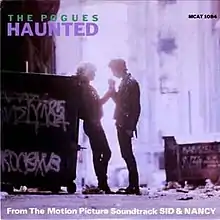 "Haunted" is a 1986 single by The Pogues. It was featured on the Sid and Nancy Soundtrack, the original soundtrack for the movie Sid and Nancy. It reached chart position #42 in the UK. Originally sung by Cait O'Riordan, in 1995 the song was re-recorded as a duet between former Pogues vocalist Shane MacGowan and Sinéad O'Connor for the Two If by Sea/Stolen Hearts soundtrack, this time reaching #30 in the UK. The original version was included on disc 1 of the 2008 compilation "Just Look Them In The Eye And Say... POGUE MAHONE!!"